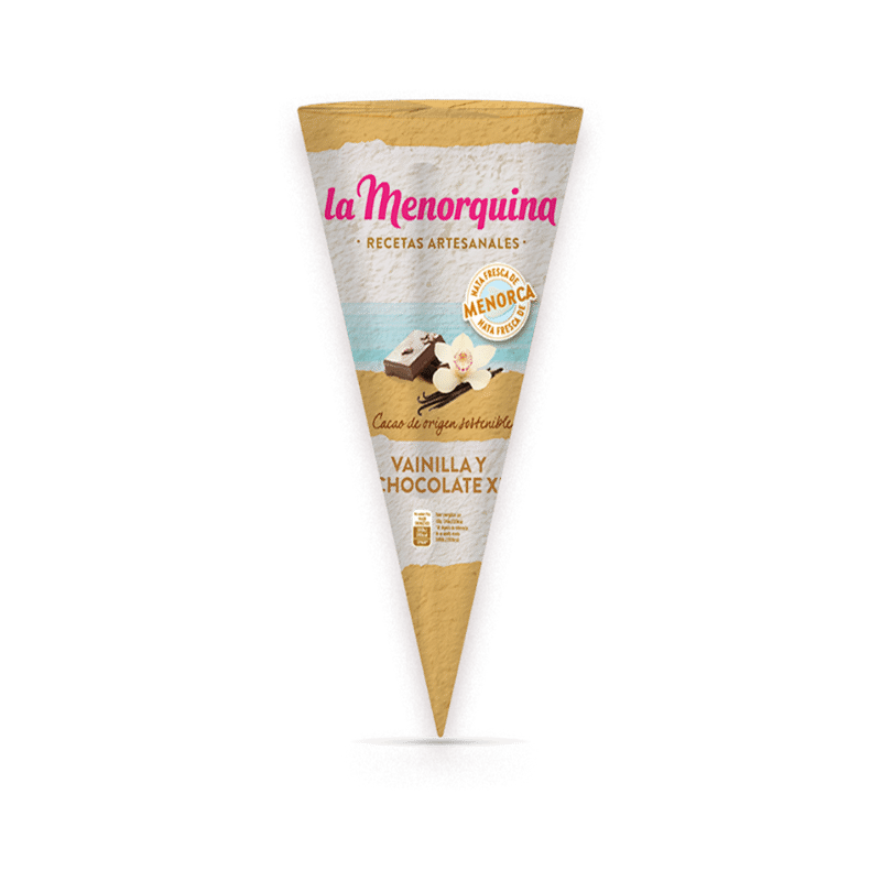 Cucurucho de helado de vainilla y chocolate elaborado con nata fresca, con topping de bolitas chocolateadas en un formato XL.
